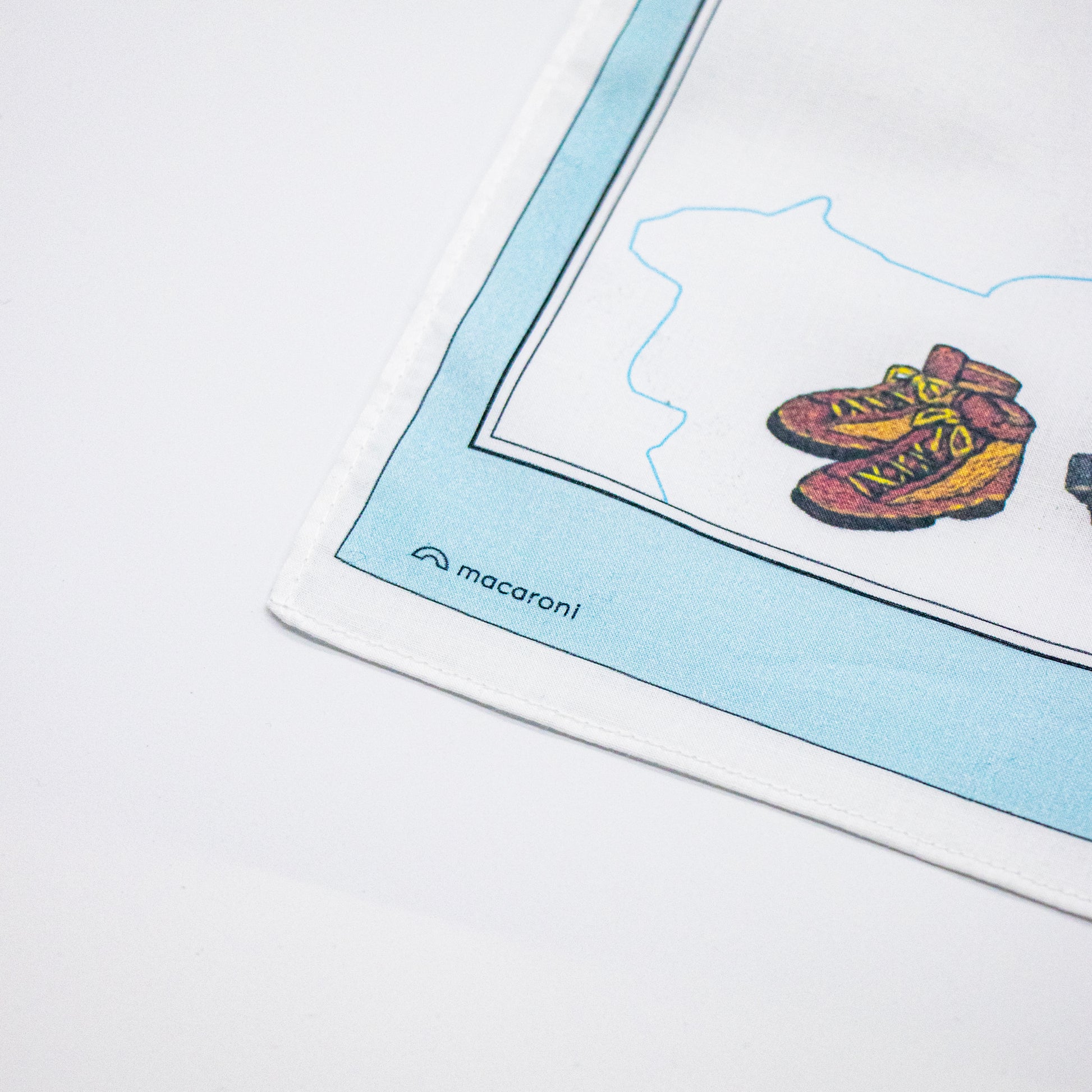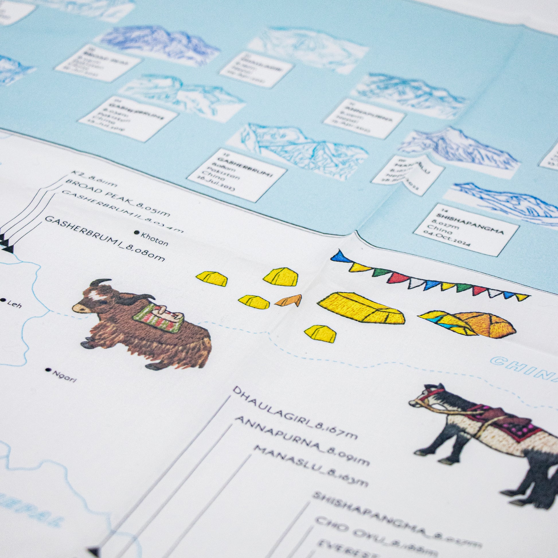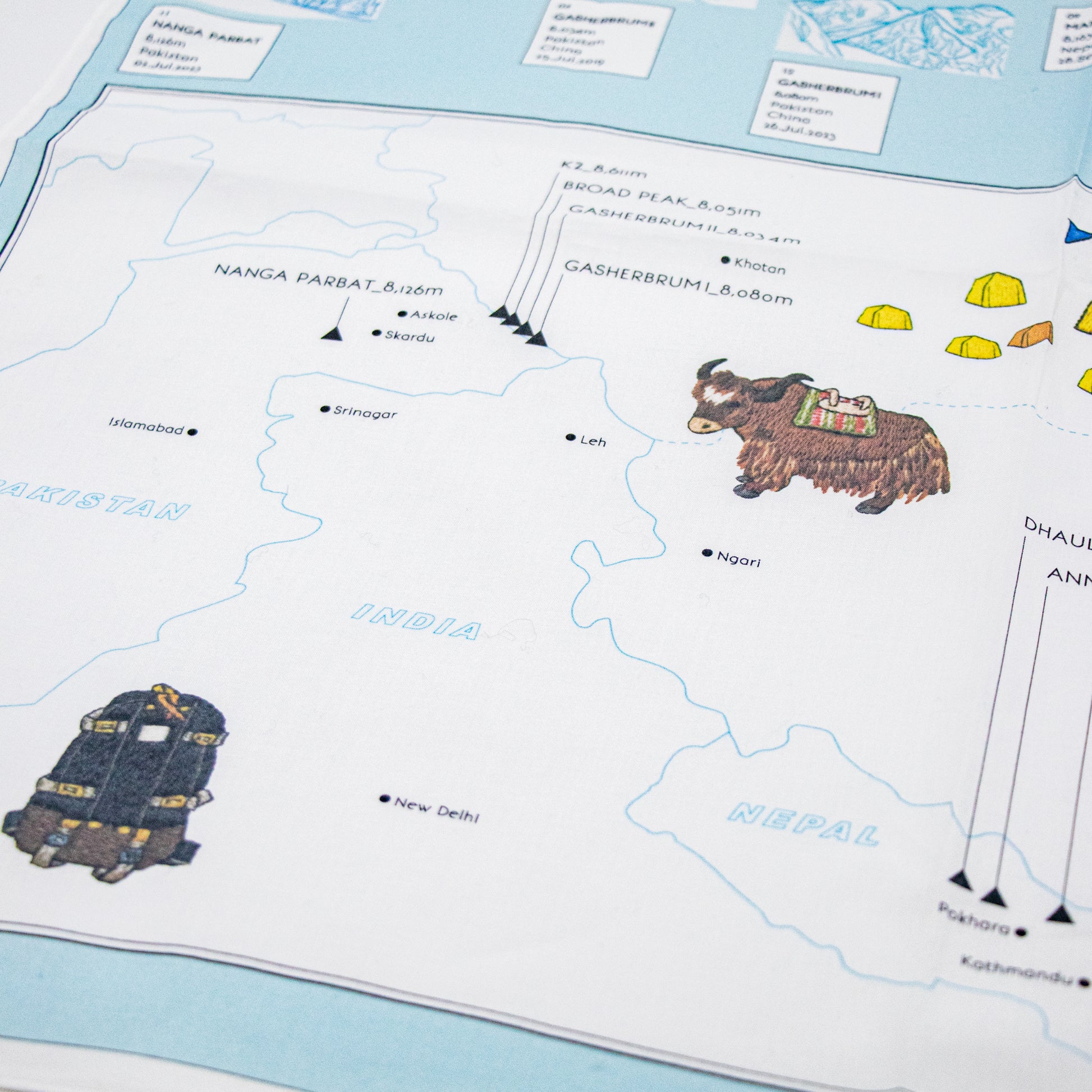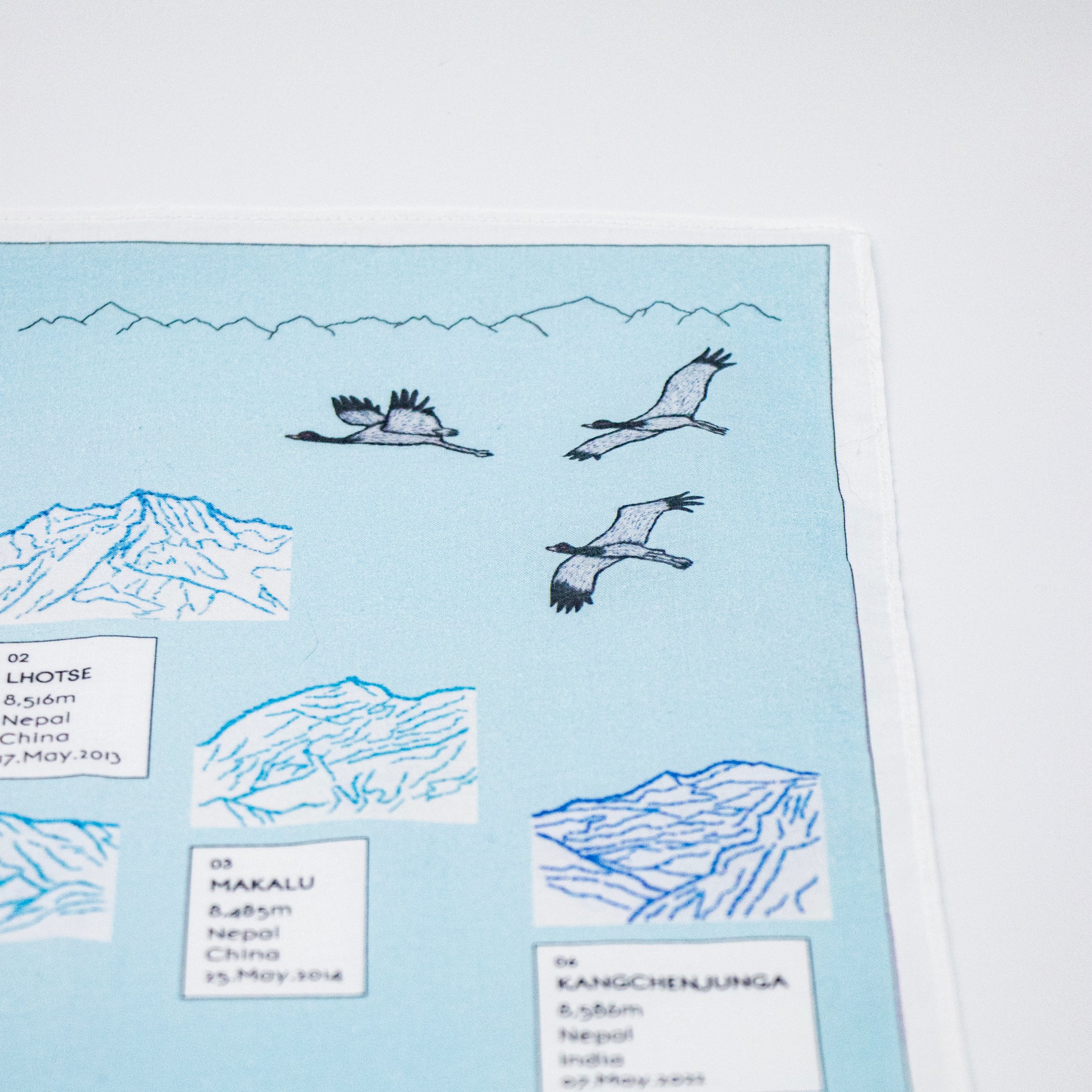 写真家の石川直樹さんが完全登頂を達成した、8000メートル峰14座。石川さんが写真に収めたそれらの山々と実際に使った山道具などを、当店では香港をモチーフにしたハンカチやキーホルダーなどでもお馴染みの刺繍作家 macaroni さんが手刺繡し、その作品をもとに制作されたハンカチ。