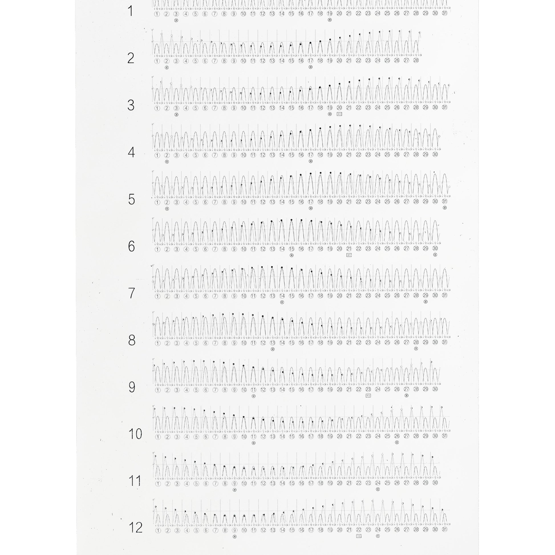 時と共に変化する太陽/月の“時刻・高度”が視覚化されていることで、季節による太陽の高度の変化や満月や新月の推移など、波のように移り変わる年間の月と太陽のスケジュールを一望することができます。
