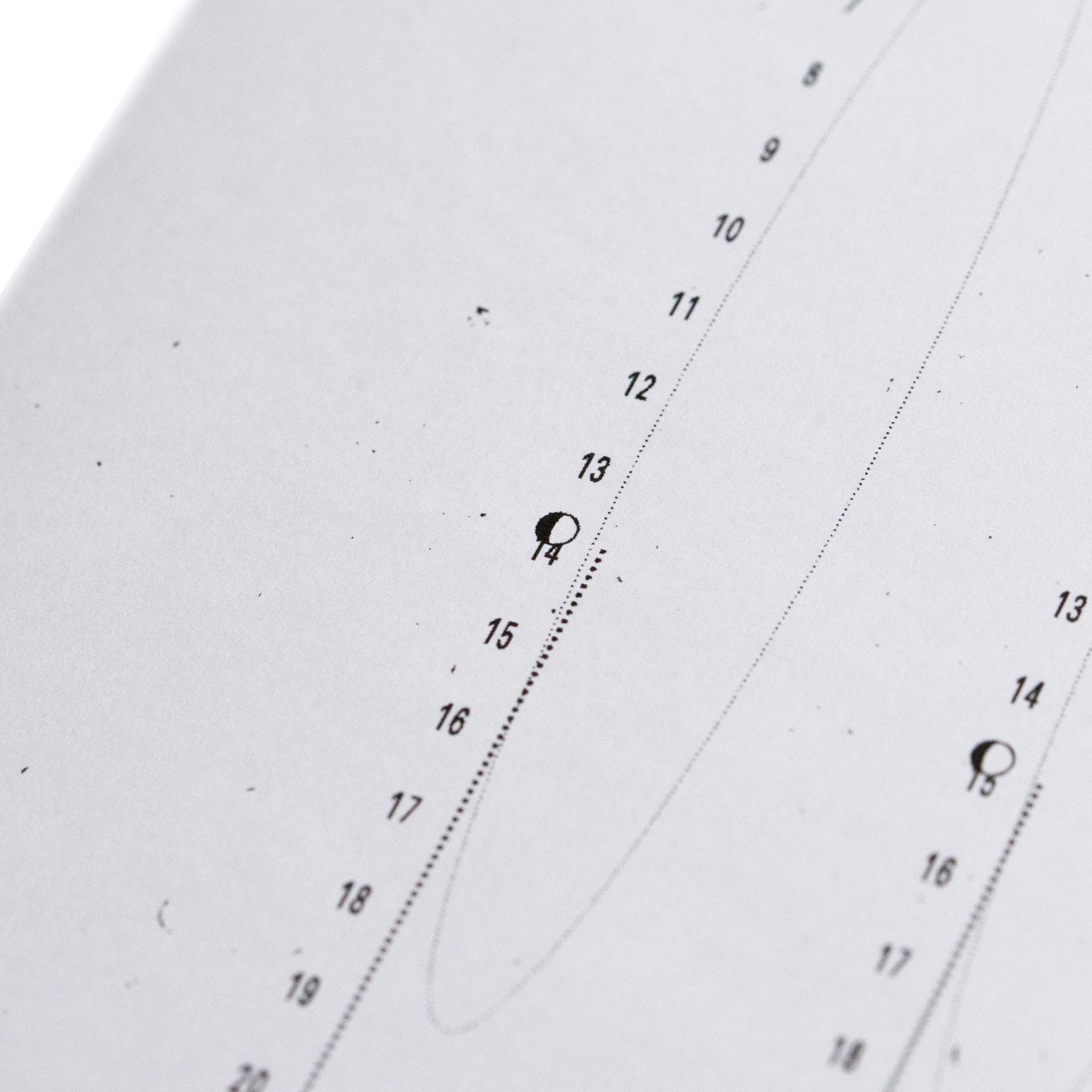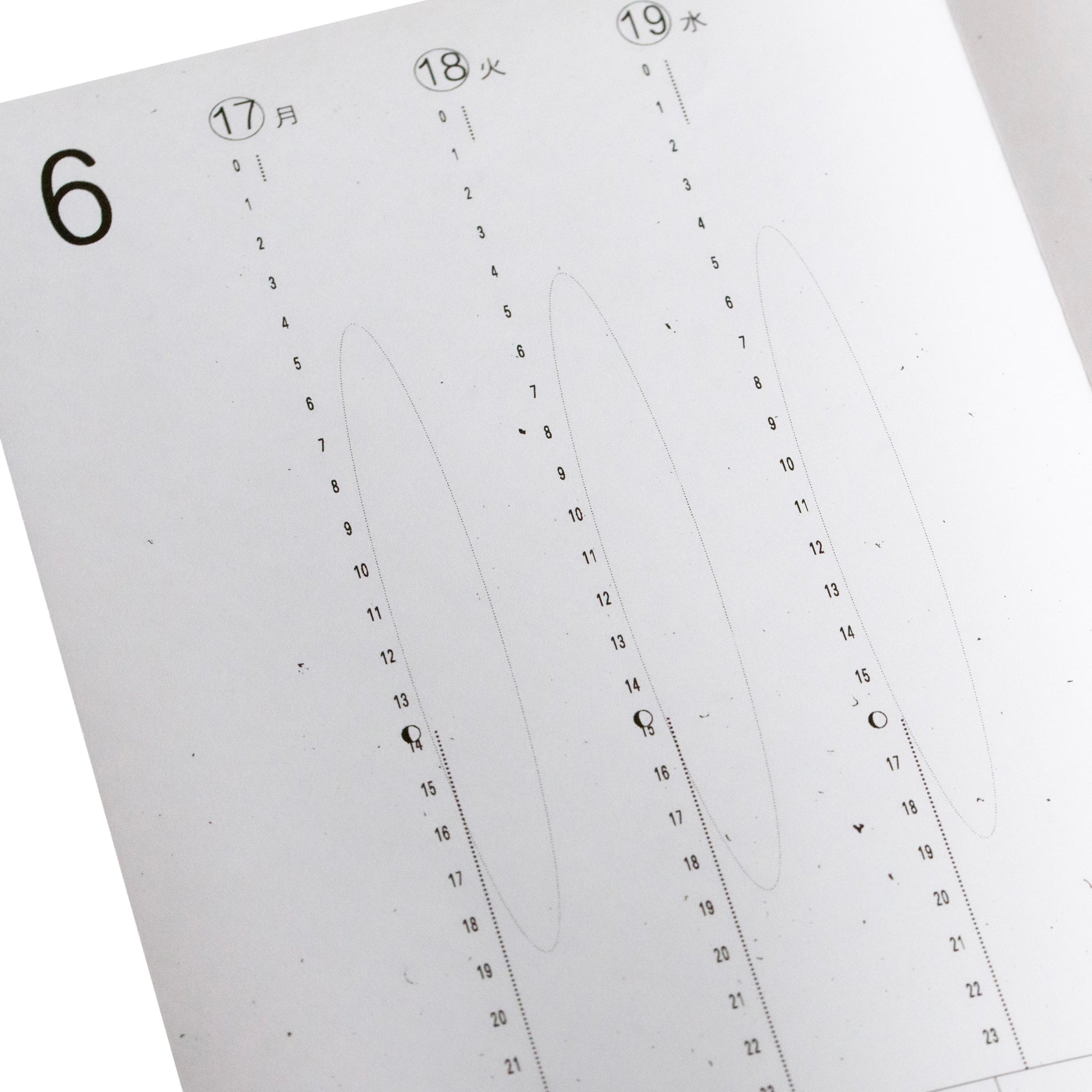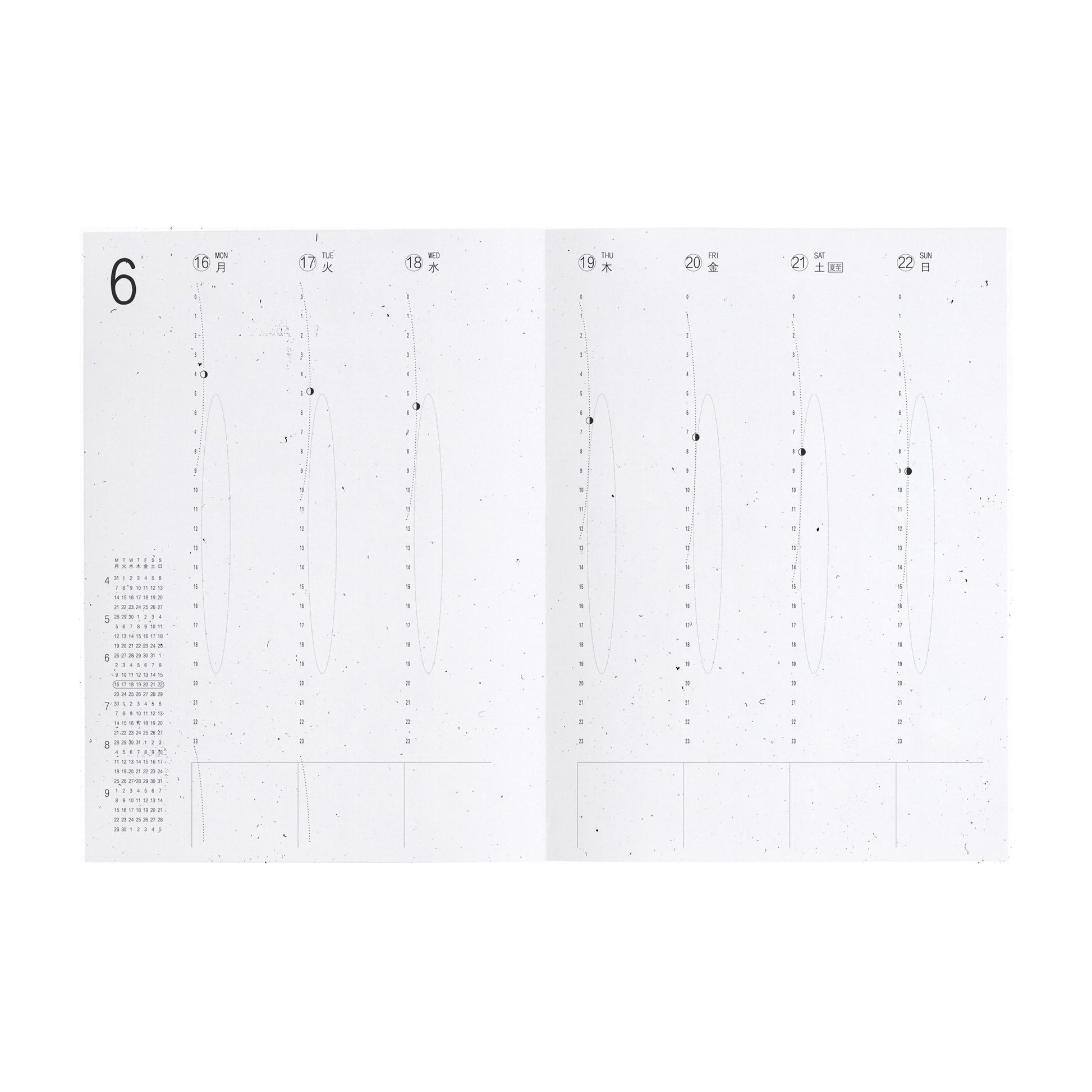1日24時間のタイムラインとともに、太陽/月の“時刻・高度”が視覚化され、いま身につけている時間感覚 (年・月・週・日・時・分・秒…) とは異なる時間軸を感じながら生活することで、時間の中を自由に散歩してゆく感覚になることを目指し作られた手帳です。