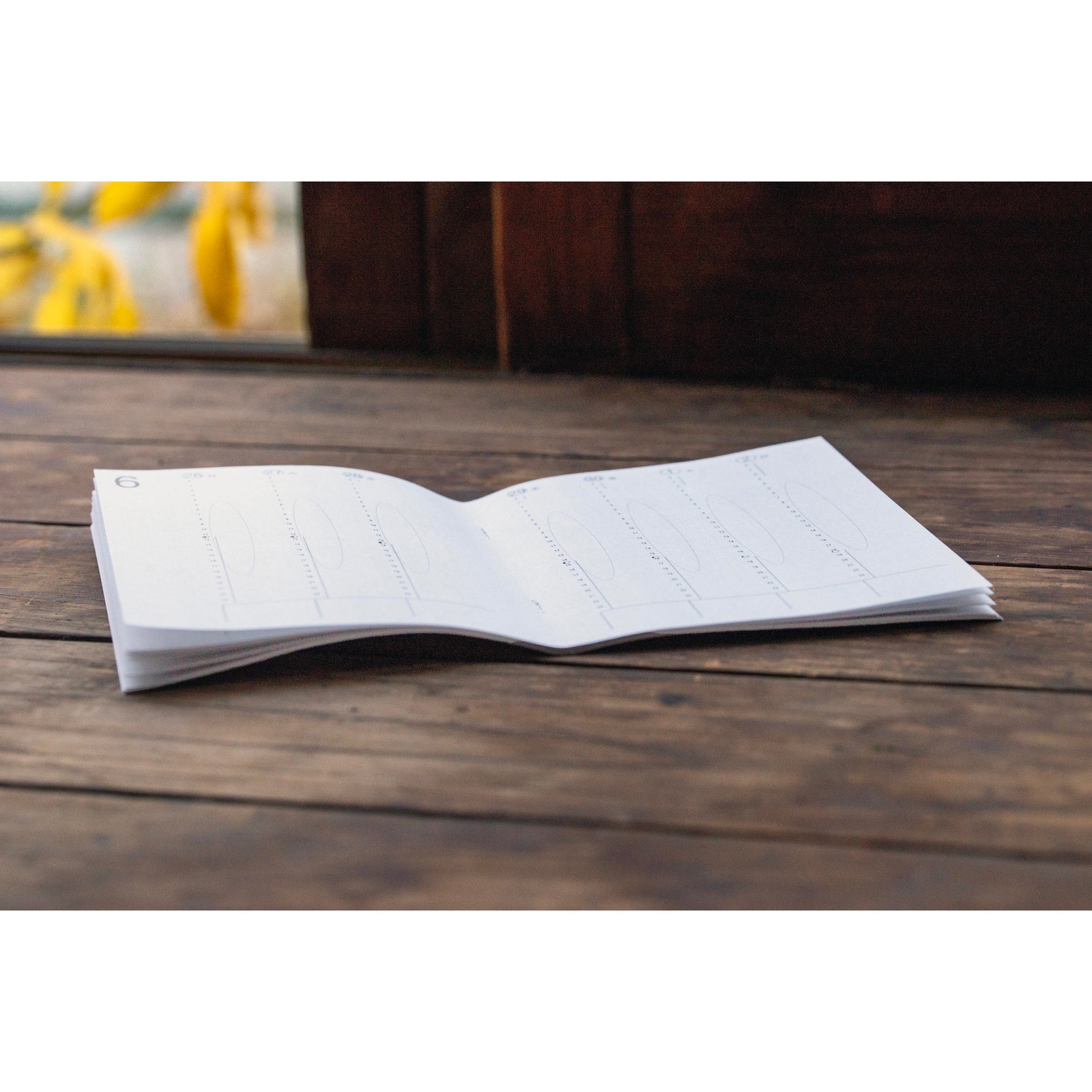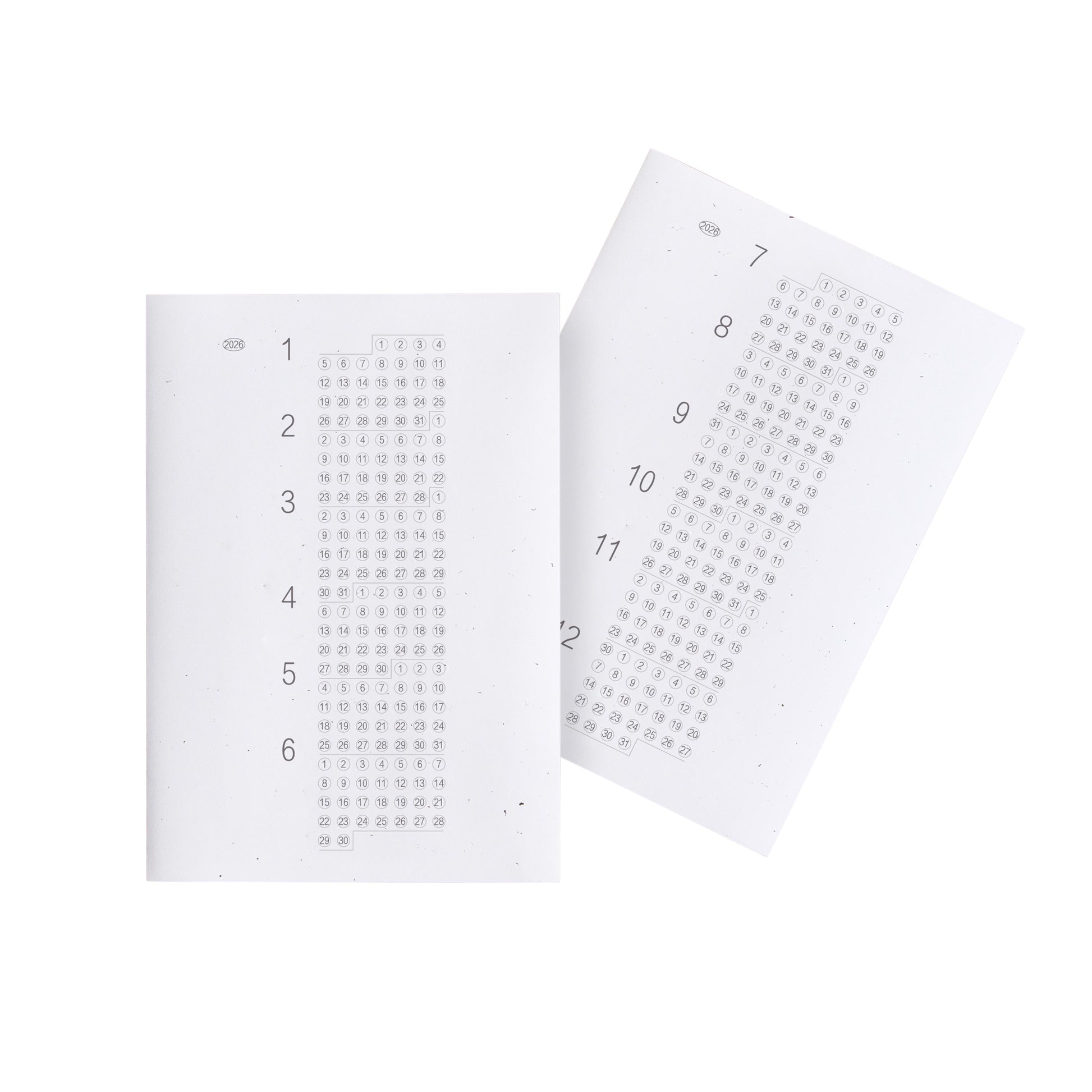 〈文庫判〉は、 ポケットに入る小さな手帳。〈中判〉は、 もう少し多くの文字を書きたい人へ向けて、「ゆったり書ける」 + 「カバンに入れやすい」 というサイズ感を吟味し、A5判より少しだけ大きいサイズ。1年分を1冊で持ち歩きたい人のために、 両面テープで貼り合わせるためのガイドラインも入っています。